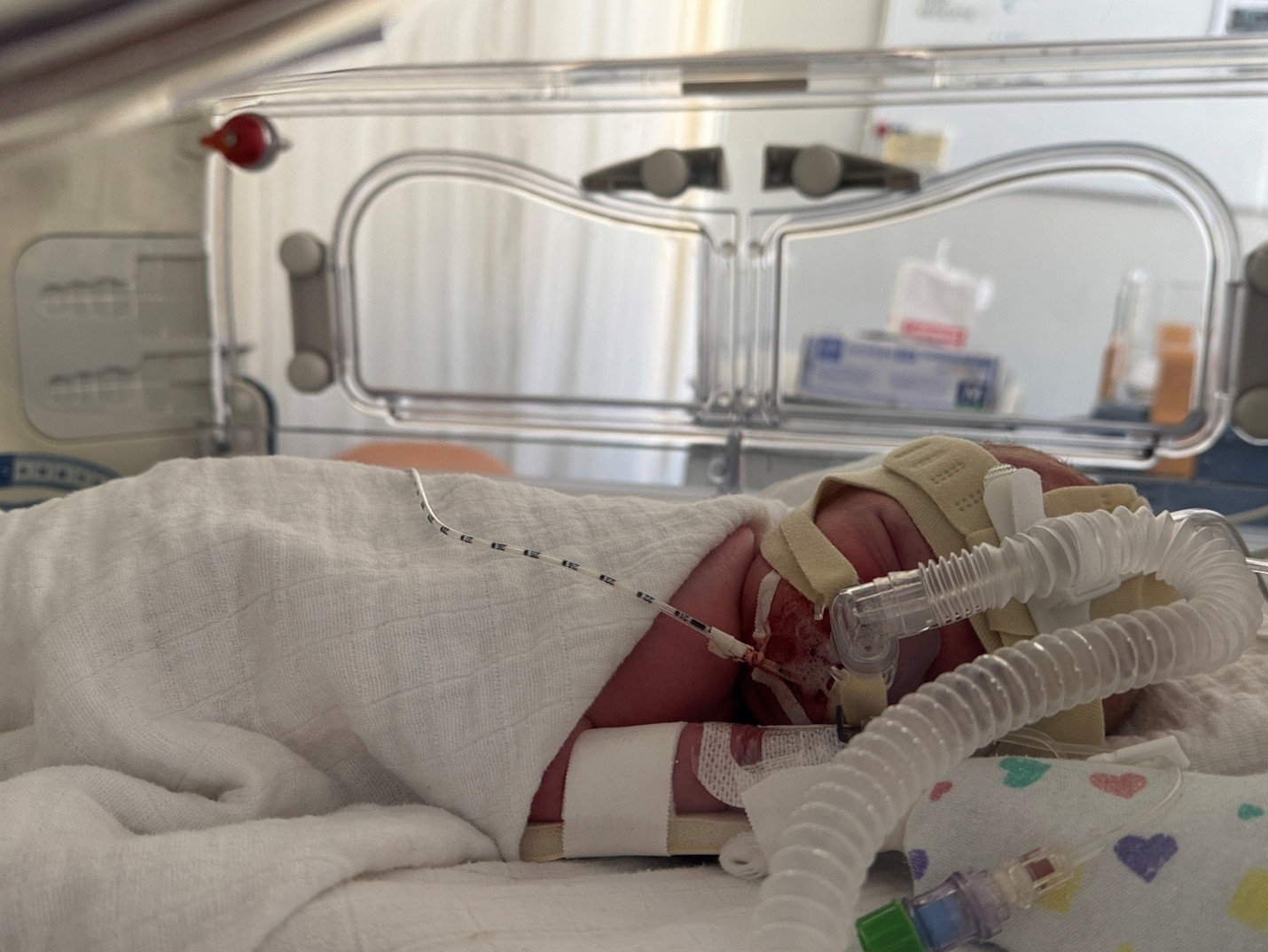 Op de operatietafel voelde ik vooral angst: zou mijn kindje het redden? En toen was hij daar: Nolan. Even zagen we hem door het afschermdoek, waarna hij meteen werd meegenomen. Ik zei tegen mijn man: “Ga achter Nolan aan, ik red het wel.” De uren daarna waren de moeilijkste van mijn leven. Na vier uur mocht ik Nolan eindelijk zien op de NICU. Omdat ik nog ziek was, moest ik handschoenen en een mondkapje dragen. Ik mocht hem een halfuur vasthouden, een onvergetelijk moment.